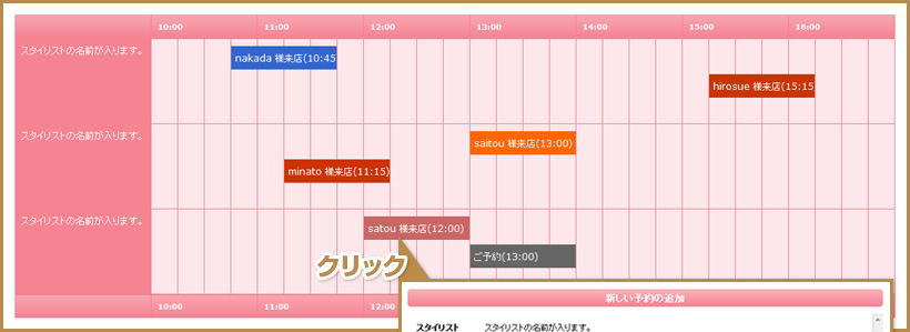 ホームページからのご予約はもちろん自動的に管理ページに反映されます。しかもお電話で頂いたご予約も管理画面上で簡単にスケジュールに追加していただくことが出来ます。
