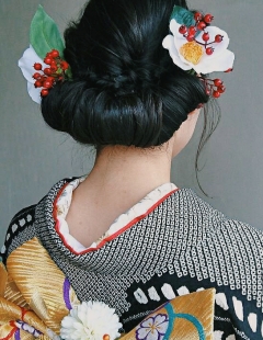 艶のある黒髪を活かして、後姿はナチュラルな大人っぽさを。まとめ過ぎず、ふわっと結うことで抜け感を出しています。正面のハネる毛先も今っぽさを出すポイント。髪飾りは造花をピンで留めました。