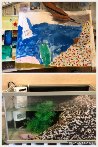 左上の青い部分は、はみ出してしまったんやと思ったけど、よく見たら水が出てきてるところを塗ったんですね😊