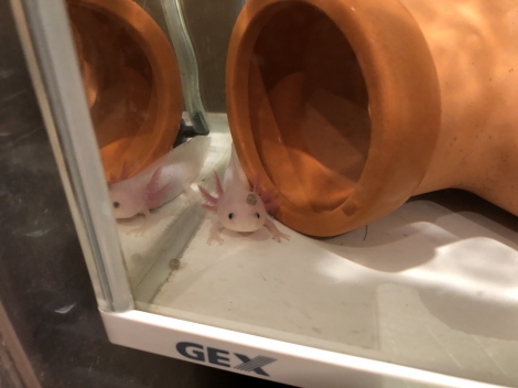↓エサが頭の上に乗ってても気づかないウーパールーパーです