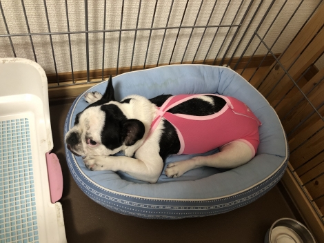 通常なら傷口を舐めたり噛んだりしないようにエリザベスカラー(メガホン📣みたいなやつ)を首につけるんですが、実はこれはレンタルで、壊したら弁償せんなんみたいです💦