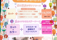 おはようございます!まだまだ暑い日は続きますね!夏の紫外線は頭皮にも髪にもダメージをうけます今のケアがとっても大切!!!そこで9,10月の頭皮も髪もケアしてくれるメニューをご紹介しますカラーメニューは8月までのキャンペーンメニューを大好評につき延長致します選べるトリ...