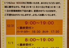 こんにちは師走も間もなく折り返し地点、サンタクロースも出発の準備を始める頃でしょうか(^^)さて、先月もお伝えしておりますが年末年始営業のご案内です。Dear NEXUSは年中無休。今回の年末年始も元気に営業しますよ~~!!ただ、これまでの年末年始と異なるのは、大みそかと...